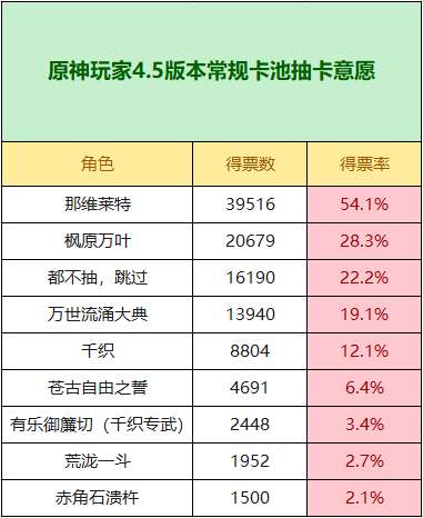 原神4.5抽卡意愿:那维莱特要被抽爆、猎人之径混池第一,上半卡池遇冷!,原神4.5版本下半卡池在3月13日就要更新了,相信很多玩家都在准备抽取4.5版本卡池。前两天,小助手