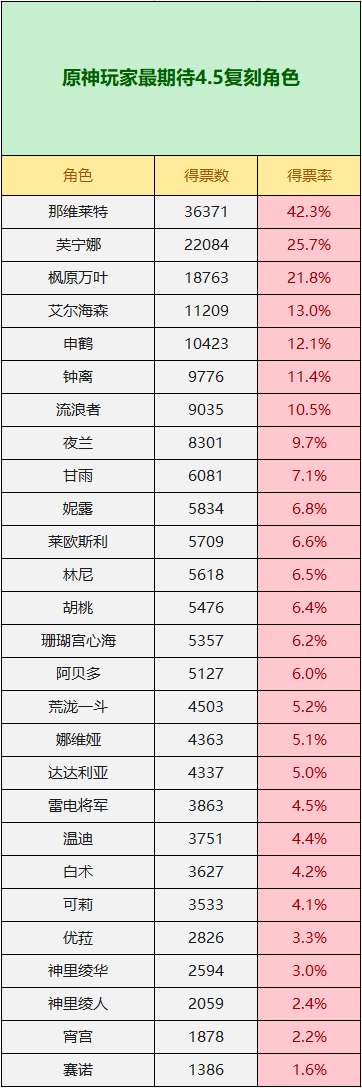 《原神》玩家最期待4.5复刻角色:那维莱特、芙宁娜、枫原万叶、艾尔海森呼声最高!,众所周知,原神中的限定五星角色只能通过UP池获取,如果错过了的话就只能等复刻了。前不久小助手发起了一