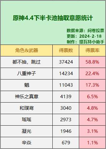 《原神》4.4下半抽卡意愿出炉,八重神子抽取意愿最高,6成玩家选择跳过!