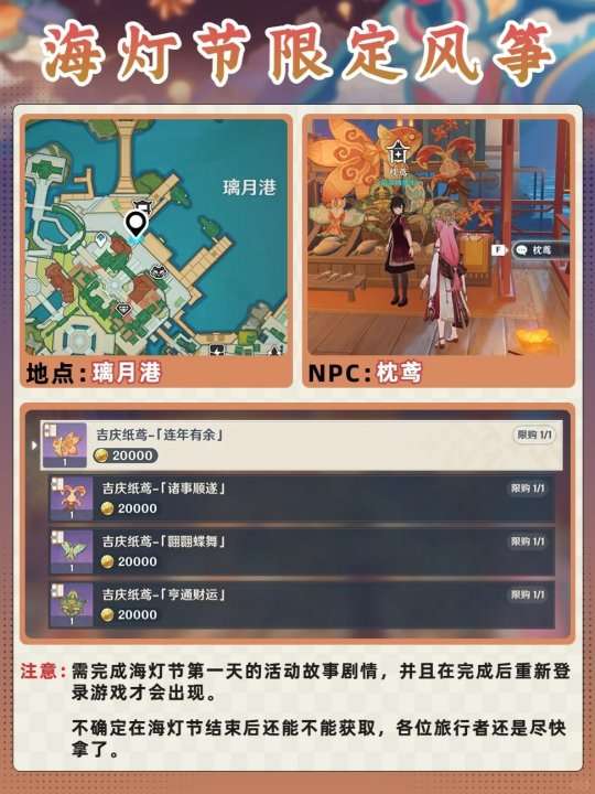 《原神》海灯节限定隐藏道具风筝获取攻略!绝版的别漏了!,在完成海灯节第一天的剧情后,再次登录一下游戏就会出现npc,直接去获取即可,一共有4只。不确定在活动