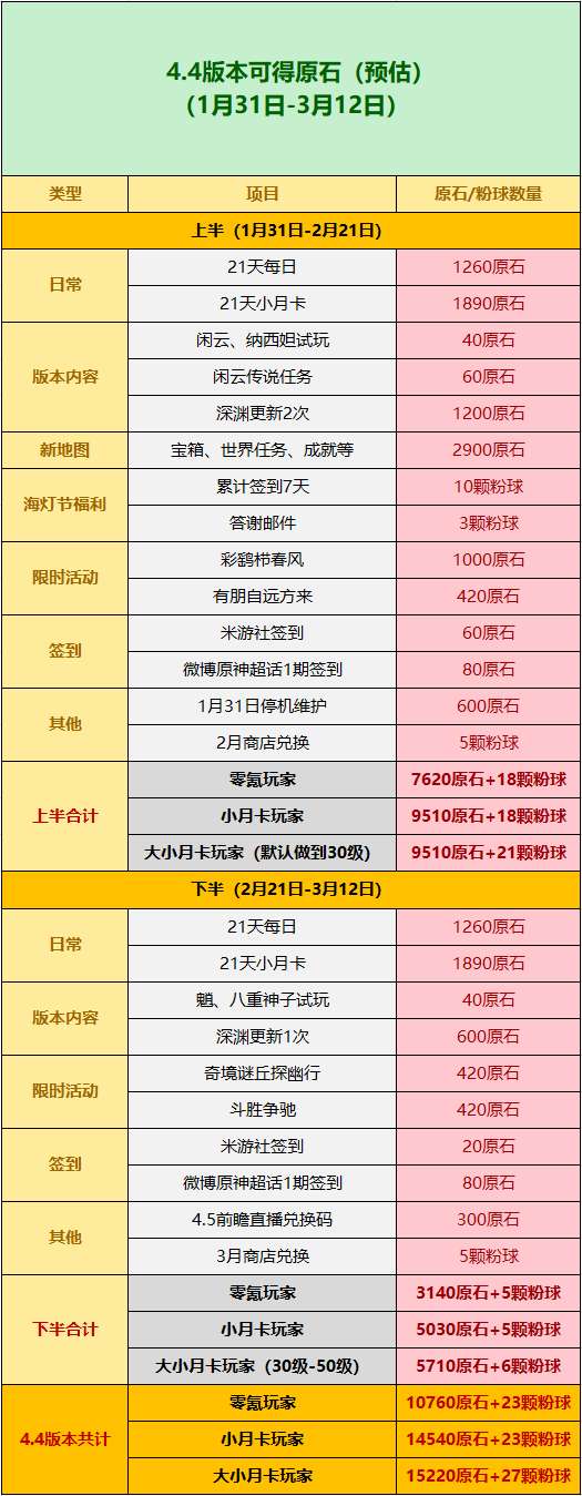 《原神》4.4版本原石统计:白嫖也有90抽,最多122抽