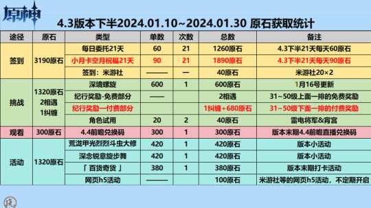 【原神】4.3下半原石获取统计
