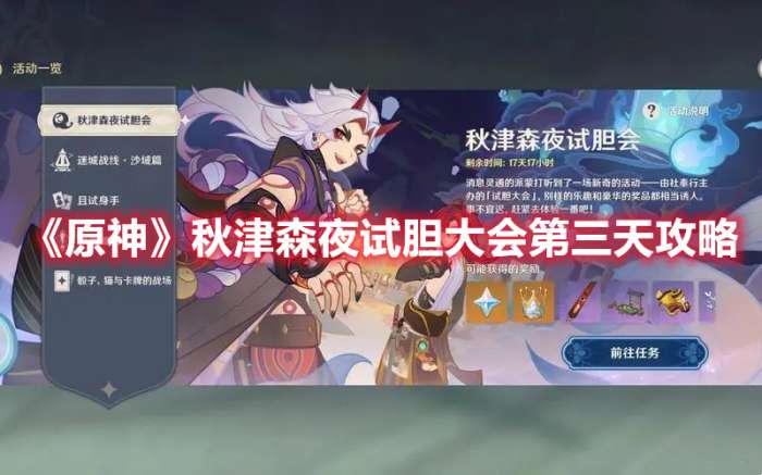 《原神》秋津森夜试胆大会是游戏中的一个特殊的活动,玩家在这次的活动中会有很多的挑战关卡需要完成,可能有玩家在进行第三天的挑战过程中还不知道怎么过,下面小编就给大家整理了具体的攻略,一起来看看吧!《原神