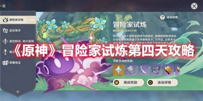 《原神》冒险家试炼是游戏中的一个特殊的活动,玩家每天都会有一个新的挑战关卡需要完成,可能有玩家在挑战活动的第四天关卡过程中不知道怎么过,下面小编就给大家整理了具体的攻略,一起来看看吧!《原神》冒险家试