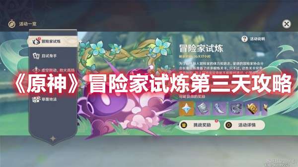 《原神》冒险家试炼是游戏中的一个全新的活动,玩家在这次的活动中每天都会解锁一个新的挑战,可能有玩家在进行第三天的挑战过程中还不知道要怎么通过,下面小编就给大家整理了具体的攻略,一起来看看吧!《原神》冒