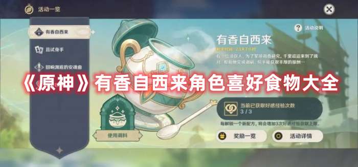 《原神》有香自西来是游戏中的全新活动,玩家可以通过活动来调配各种调料来获取奖励,同时制作出来的物品还可以邀请角色进行品尝来提升好感度,不过角色的喜好还是会影响到评价和好感度的提升的,下面小编就给看大家