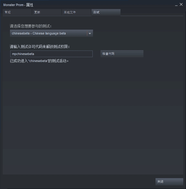 只要在Steam库中右键《魔物学园:毕业舞会大作战》,依次点选【属性】→【测试】,在文本框中键入mpchinesebeta,点击【检查代码】并选择chinesebeta,即可体验官方中文版游戏。