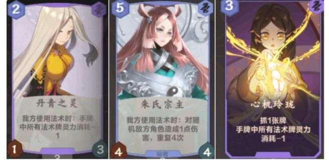 2.丹青和心机玲珑组合的快速减费,然后宗主配合数个低费法术在一回合内输出巨量伤害乃至直接斩杀。
