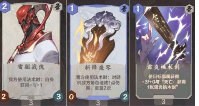 低费法术中桃木剑和酒神的使用非常重要,桃木剑可以有就用但最好用在一号位以免放空(对风,灵等有回手的职业要慎重使用)。酒神则需要多一点考虑:如果你的生物在酒神BUFF以后连一次攻击都没有,那你就纯亏了一牌,所以要确保能A出去才用是收益最大的。小雷符的使用比较灵活,你可以把它单纯当特效触发器,也可以憋一定伤害再用。需要注意的是小雷符容易被生物阻挡,所以它并不是一个可靠的斩杀手段。
