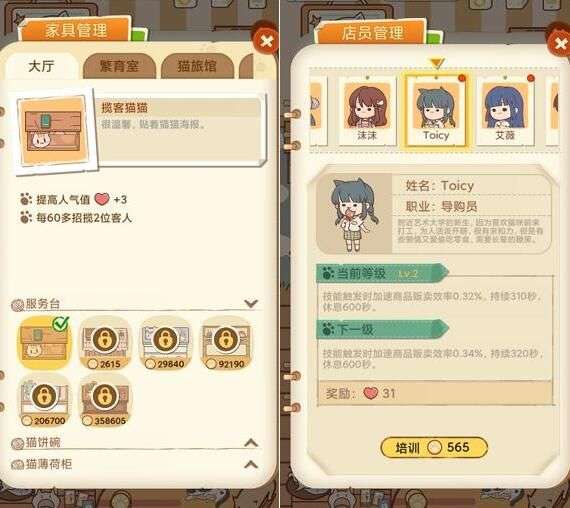 游戏中,我们的猫舍小店一旦开启,就会有源源不断的客人前来消费,不过客流量和客人的消费水平会受到猫舍人气、环境等因素的影响,如果想要获得更多的收益,就需要通过不断的添置家具、改善猫舍环境、雇佣店员等方法来达成。