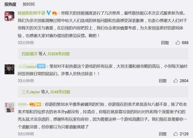 而对于策划临时改动式神技能的操作,不少玩家的怒气直接被点燃,纷纷在评论区进行吐槽,要求阴阳师策划能够自己辞职。尤其是在最近帝释天技能的争议问题被曝光后,很多玩家认为这次策划不够谨慎用心所致,从而让一个人气极高的式神在PVE和PVP中反复横跳,闹出了不少的笑话,也让部分厨力玩家痛苦不已。