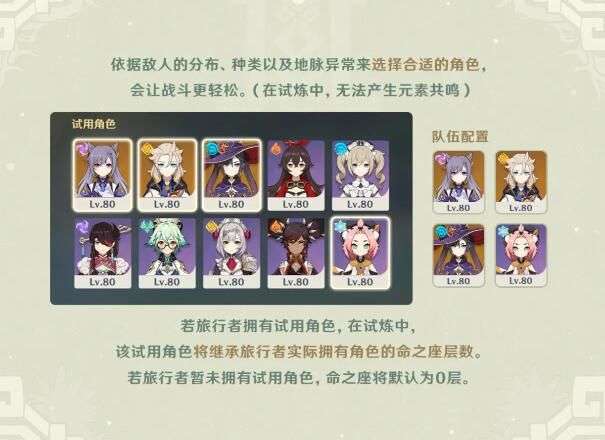 活动期间,旅行者可以使用指定的试用角色编队并挑战6个不同主题的试炼,完成试炼任务可获得原石、大英雄的经验、天赋培养材料等奖励。