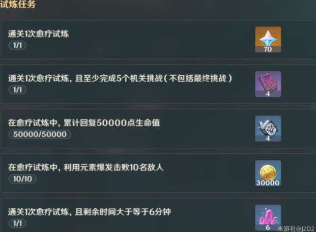 需要注意的是累计回复50000点生命值任务和利用元素爆发击败10名敌人。没法一次性完成没关系,可以重新挑战完成,完成后直接退出即可,不必再次通关。其中回复生命值任务可让多名角色主动受到喷火机关伤害,然后芭芭拉一个Q即可完成任务。
