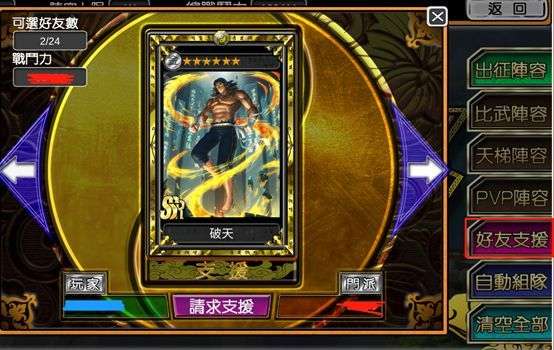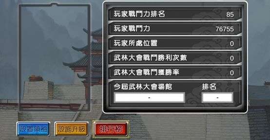 演武场:1-15级,上阵武侠、好友支援、属性加成。升级增加上阵武侠数量,上限6人。