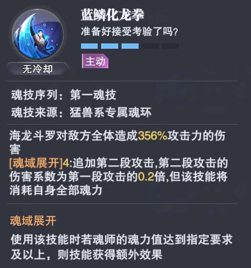 2、1-1技能【蓝鳞化龙拳】的核心作用是长图打伤害,特点是海龙的魂力越多,其附加的第二段伤害则越高,但此次伤害会消耗所有的魂力,因此海龙不仅要求其魂力上限要高(需要波赛西的【海神祝福】),还得需要每回合都能回复大量的魂力(需要小白的【海神圣谕】),这也是他为何被称为祝福流魂师的最大原因。