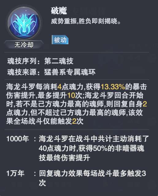 3、接着2-1技能【破魔】的效果则是增伤,其不仅可以通过消耗魂力来提升博阿上,同时还可以在共计消耗了40点魂力后获得非暗器最终伤害分提升,这也无疑说明了海龙并不能带动暗器队伍的特点。