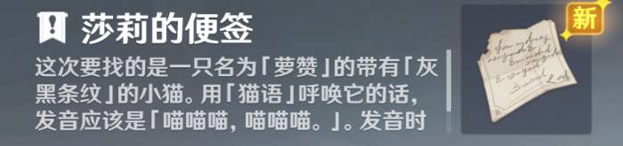 进入委托对话完成后,我们会获得一张纸条,纸条内容就是这次需要寻找的猫咪以及对应的猫语。