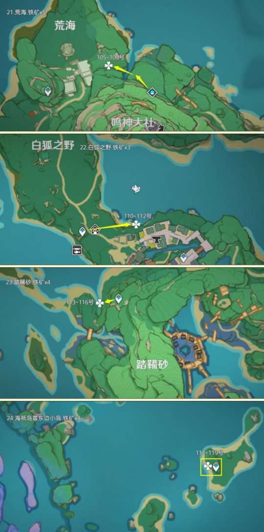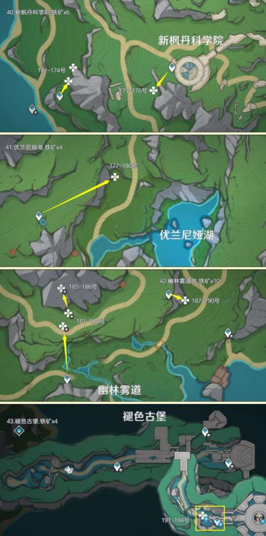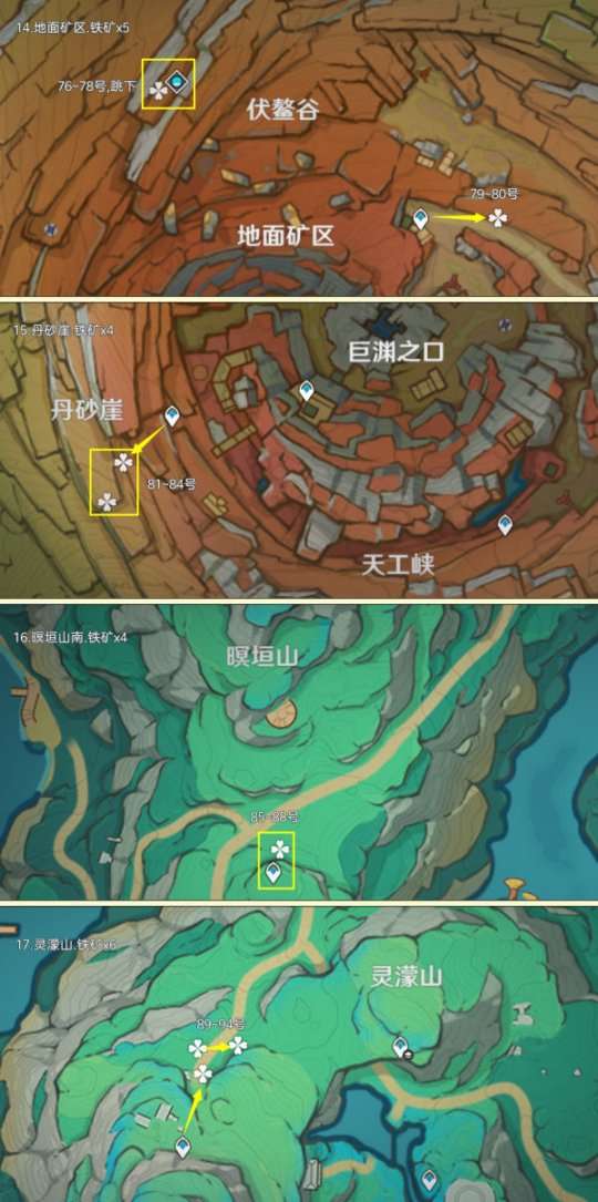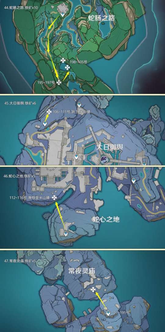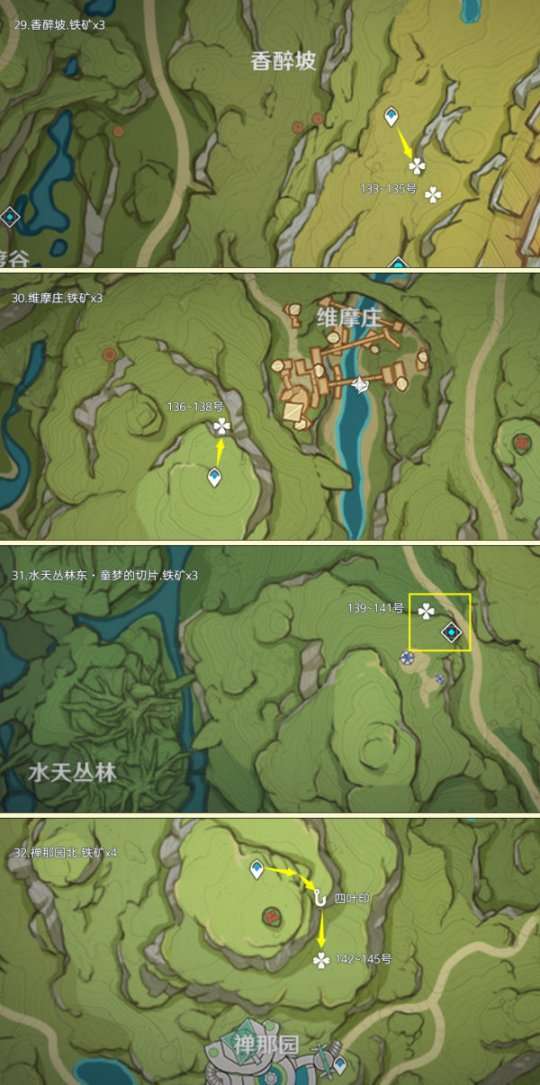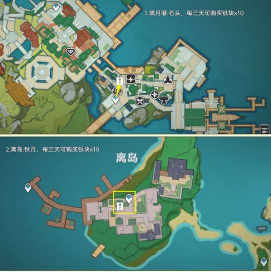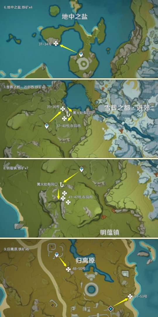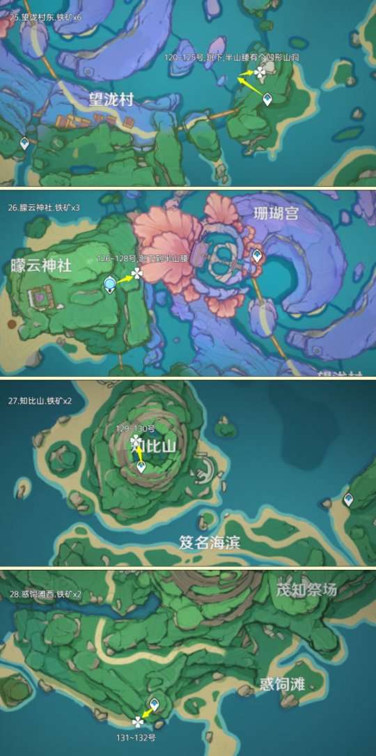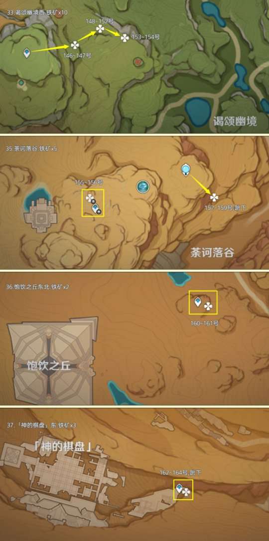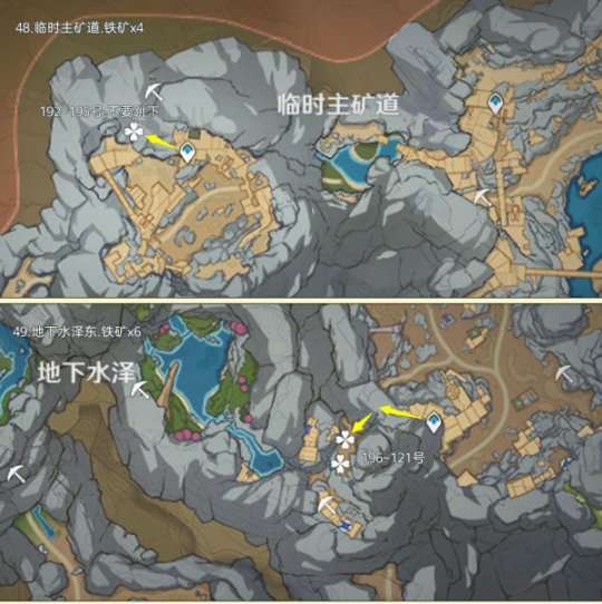 铁矿点位广泛的分布在提瓦特地区,其中可重复采集高效点为121个,另外还有2位NPC商店可购买;制作路线时尽量遵循从上往下游,视野高好看清,方便旅行者探索。