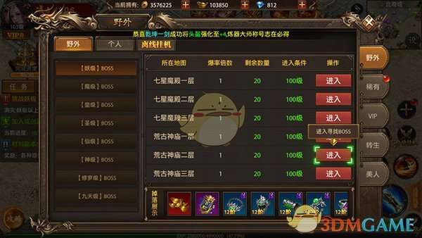 玩家可以在野外地图进行挂机挑战,自动挂机战斗,解放双手,轻松升级提升,更有各种野外和个人BOSS可以挑战,获取大量装备资源。