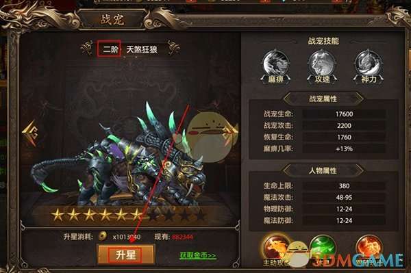 玩家解锁战宠系统后即可获得,通过升级升星等可以给战宠提升战力阶级,解锁形态,增加战宠伤害。