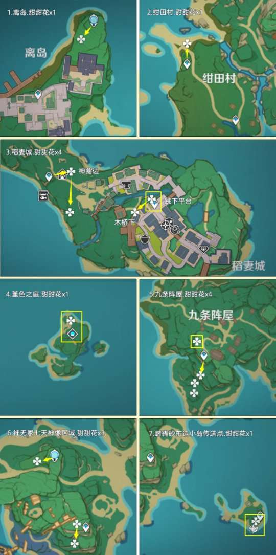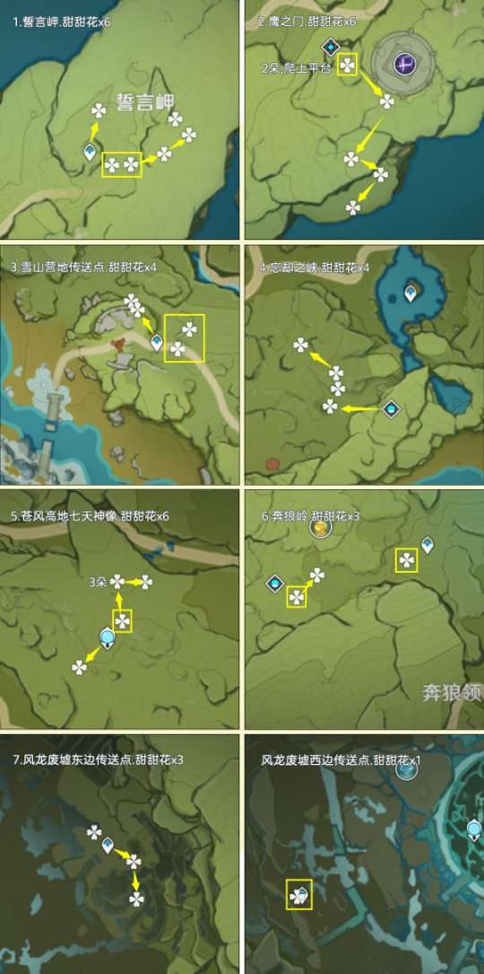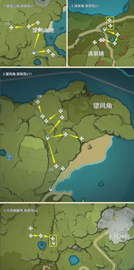 甜甜花点位广泛地分布在提瓦特全部区域内,其中高效率可采集数量为402朵,加上NPC购买10朵,总共最多可以获得402+10=412朵甜甜花
