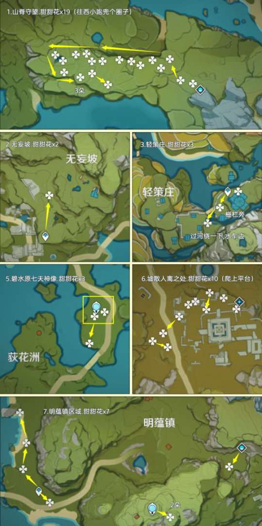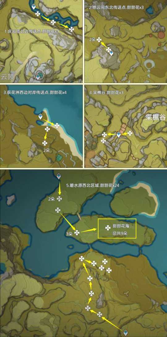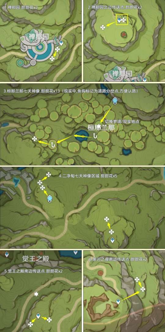 重要提示:1.未特意说出几个的均为1朵甜甜花;2.鱼钩标记为洞口/分支路线等,方便寻路