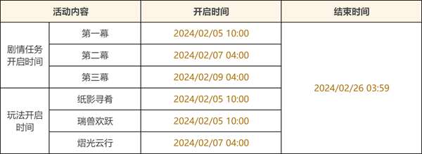 ● 活动期间,将陆续解锁「纸影寻肴」、「瑞兽欢跃」、「熠光云行」各阶段玩法。