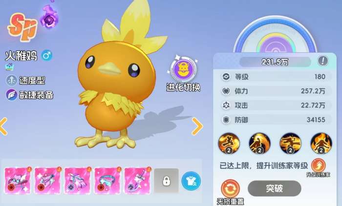 不过,玩家们要想获得超级火焰鸡,还得先将初始为月亮1阶的火稚鸡升阶16次,以便解锁MEGA进化的前置条件,然后再在MEGA兑换商店开放后,去兑换出一张超级火焰鸡的进化卡,才能令火稚鸡从SP级突破至UR级,成为超级火焰鸡,整体难度比较高。再加上火稚鸡本身为极难获得的SP宝可梦,升阶又需要较多的火稚鸡本体,培养周期较长,各位最好慢慢积攒升阶所需的一切资源,不要过于着急进行超级火焰鸡的培养,打乱自己的养成节奏。