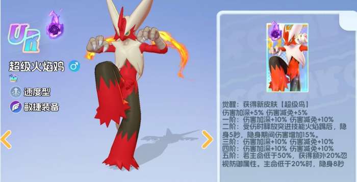 超级火焰鸡是火稚鸡的进化形态,它除了会继承火稚鸡初始的四个技能外,还会在完成进化后获得一个额外超加速燃烧技能。该技能在初始时只会为超级火焰鸡提供5%的伤害加成和伤害减免,但若是能将超级火焰鸡的MEGA进化突破至上限,那么额外超加速燃烧一共会为此宝可梦提供35%的伤害加成和伤害减免,且超级火焰鸡在受伤期间进行火焰踢的释放后,还能因此隐身5秒,同时会在隐身持续的时间内获得更多的加成。这一效果不光强化了超级火焰鸡的生存能力,也提升了它切后排的成功率。