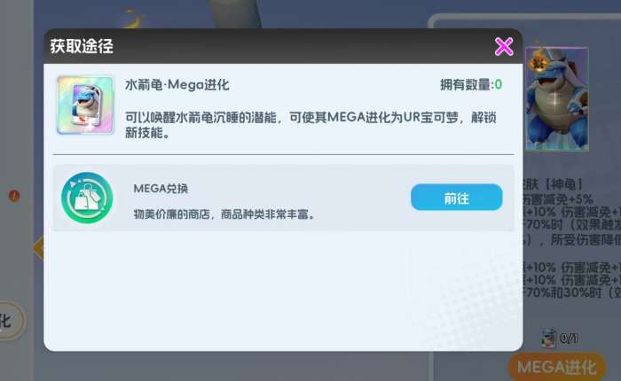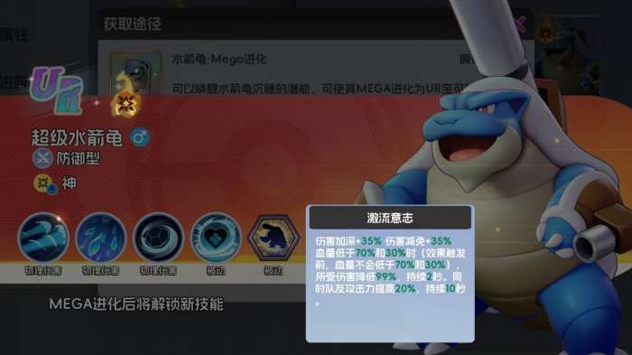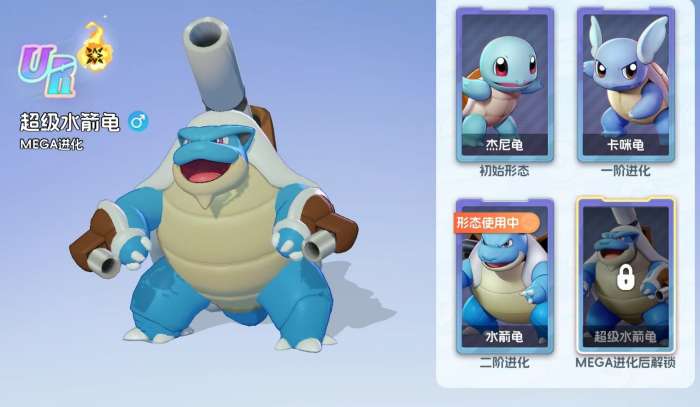 超级水箭龟的获取方式也很直观,玩家们在获得月亮1阶的杰尼龟后,还要继续为它升阶16次,进而才能解锁杰尼龟的MEGA进化。接着,各位需前往MEGA兑换获取水箭龟的MEGA进化卡,为杰尼龟消耗1张后,就能让杰尼龟成功完成MEGA进化,变成UR级的超级水箭龟。此后,玩家若想完成MEGA进化的突破,还需要继续去换购水箭龟的MEGA进化卡,直至它的MEGA进化达到五阶上限。