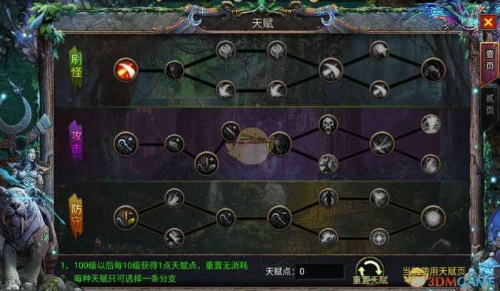 (1) 天赋系统由刷怪、攻击、防守三部分组成,消耗天赋点升级天赋等级(100级以后每天10级获得1点天赋点,重置无消耗;每种天赋只可选择一条分支)
