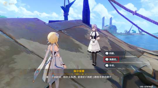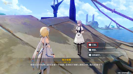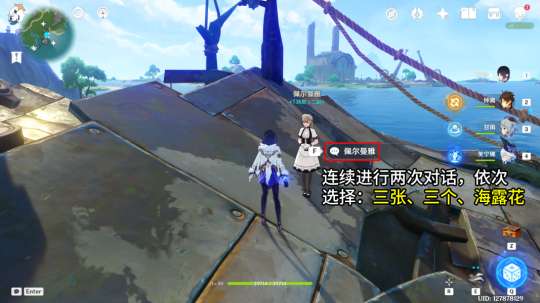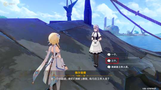 2.和NPC佩尔曼雅连续进行两次对话,第二次对话时依次选择:三张、三个、海露花