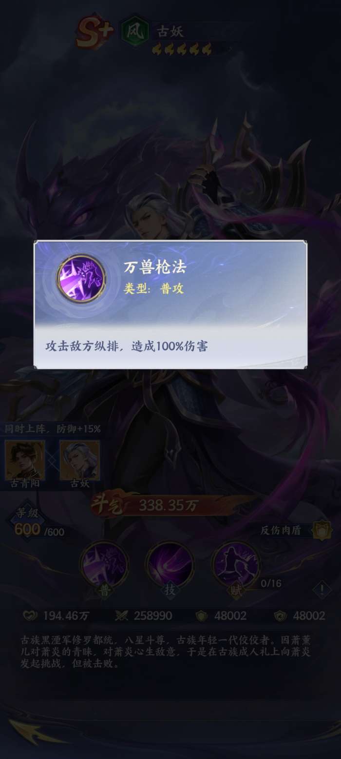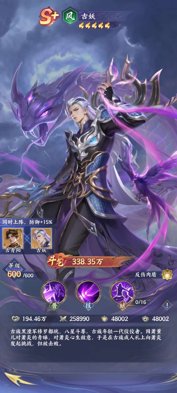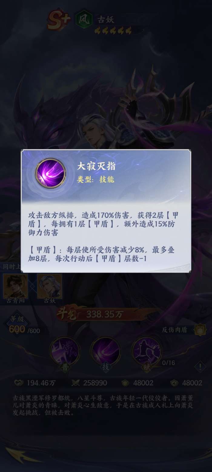 要说古妖,他其实作为肉盾,在整个游戏当中一旦被挨打之后,他就会出现反伤的情况。另外它的防御也能够达到减伤的目的。而他作为S+级别的英雄,玩家获得古妖之后,其实也需要合理的运用他的甲盾,通常情况下可以使受伤害减少,并且还能够叠加,而每次行动之后,它的层数就会减少,也能够有效地施展技能大寂灭指,在这样的情况下就能够有效的攻击敌人,并且还能够直接形成了高额的伤害。