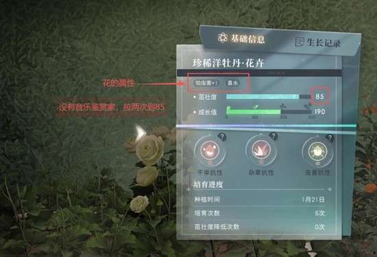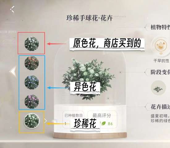 得到异色花 or 珍稀花,每次培育出的种子都种下,珍稀花不用拉二胡!出珍稀花之前的异色花都建议拉二胡