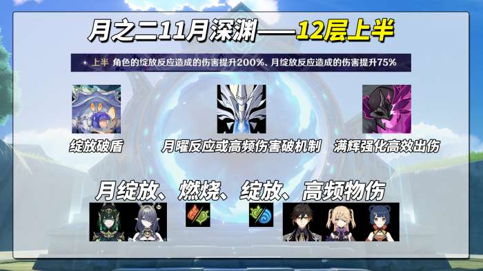 12-2上半,霜夜巡天灵主(425万血)。开局会进入「晦隐」状态,全抗大幅提升,需50次伤害破除。若期间受伤为物理或月曜反应则无事发生,若为其他元素或反应则会全程附着并免疫伤害最高元素。