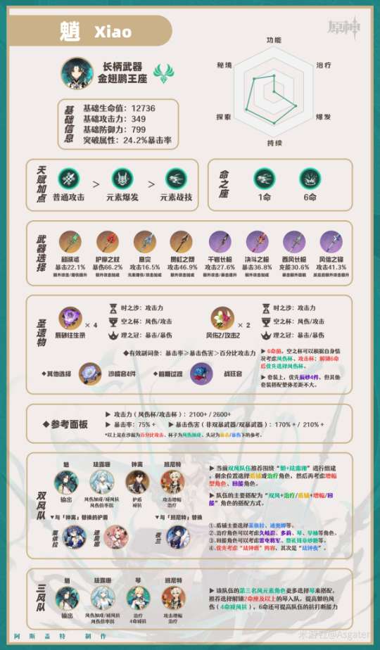这里是阿斯盖特,本期是「降魔大圣」——「魈」的角色攻略~本期将着重于角色本身,讲解天赋机制、武器和圣遗物等装备的选择,以及在3.3版本「珐露珊」登场后的相关配队搭配内容~