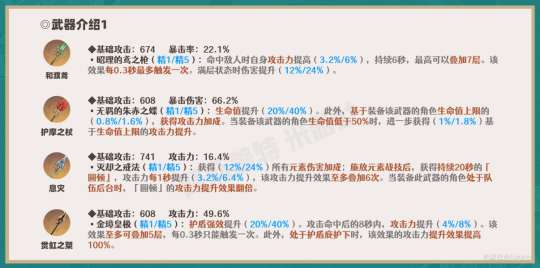 ②.在4星武器的选择上,优先千岩长枪、决斗之枪、黑岩刺枪等可以带来双暴属性提升的武器,此外则是副属性为攻击力的武器,如宗室猎枪、风信之锋等,根据武器的精炼等级进行考虑。