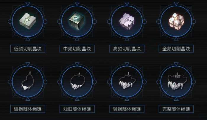 武器突破所需材料包括破损隧体绳链、低频切削晶块、中频切削晶块、微损隧体绳链以及完整隧体绳链,各阶段具体数量配置可参考下方图示说明。