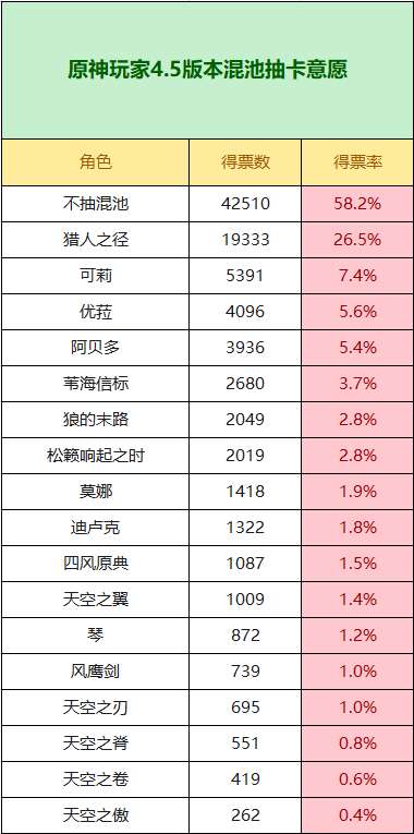 软件提交 专题合集 热门手游原神4.5版本下半卡池在3月13日就要更新了,相信很多玩家都在准备抽取4.5版本卡池。前两天,小助手发起了《原神4.5版本抽卡意愿统计,你都打算抽什么角色?》的统计,共有7.2W人参与投票,下面就一起带大家来看看最终的结果如何。