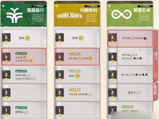 富森银行和莱茵生命是“企业大亨”游戏中比较特别的两个效果。选择富森银行后,由于吸取对手分数的效果很具攻击性,所以你需要保持低调,跟随其他玩家一起攻击目前排名第一的玩家,不要过早地触发四级特效,否则你可能会成为众矢之的。而选择莱茵生命后,由于不能稳定获得金券换分的奖励,你需要善用其他科室版的奖励来获得分数。