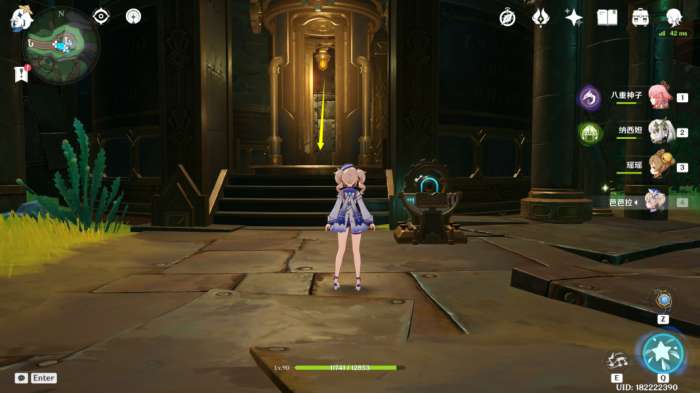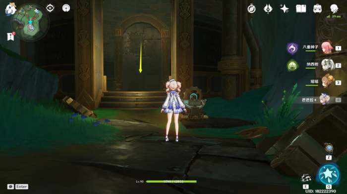 之后回头转东南方向视角,往前走到拐角处,能发现房间中央有个遗迹大门,进到大门内