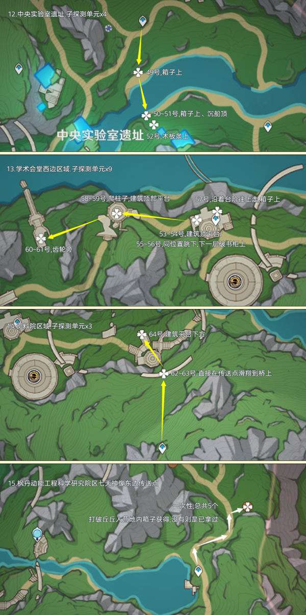 子探测单元点位仅分布在枫丹4.1地图中,其中高效率点有黎翡区七天神像、新枫丹科学院和学术会堂这几个个,可重复采集数量有71个,一次性点位有6个,总共有77个,而且需要靠的很近才能加载出来;制作路线时尽量遵循从上往下游,视野高好看清,方便旅行者探索。