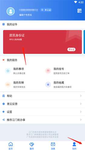 软件提交 专题合集 热门手游在江门易办事APP进行实名认证,可先打开软件,点击底端“我的”选项,再点击“居民身份证”选项,接着输入真实姓名与身份证号,按提示完成操作即可完成实名认证,实名认证后能解锁更多功能,如预约服务等。