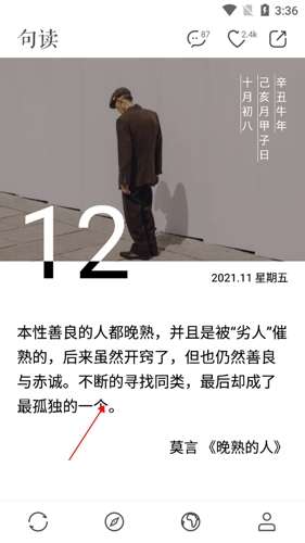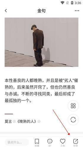 软件提交 专题合集 热门手游在句读首页或发现页找到想要分享的句子卡片,点击进入详情页后,点击右下角“分享”按钮,选择分享至微信、QQ、微博等社交平台,或直接复制链接分享给好友;部分版本支持生成精美图片卡片,点击“生成图片”后保存至相册,再通过相册分享至其他平台。