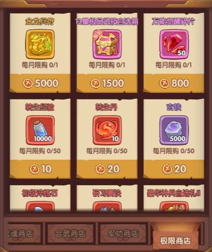 主公们可以从活动中的排名奖励和目标奖励可以获得大量极限币,极限币在极限商店兑换各种高品质道具以及各种养成资源。主公们可以在这里自选养成资源,为下一次极限激斗做准备。