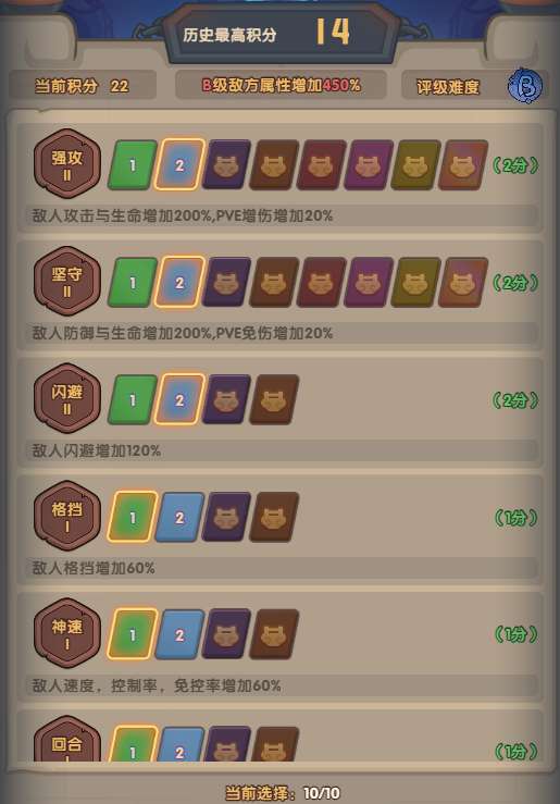 词条还有等级之分,等级越高的词条为boss提供的属性会越多,但击败boss后所能提供的积分也会越多。这意味着主公们可以通过不断提升词条等级来追求更高的积分。这里阿馋给主公们分享一个小技巧,"回合"以及"审判"词条虽然提供的积分不多,但每提升1级都是对主公战力的极大考验。