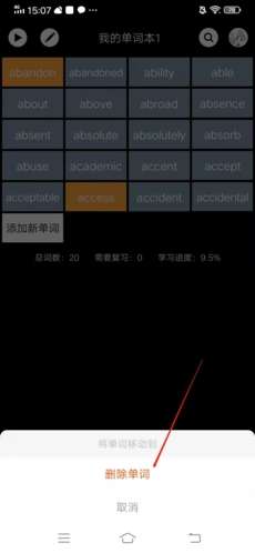 2、按住一会后,就会有下方窗口弹出,点击“删除单词”后就能成功将该单词删除了。