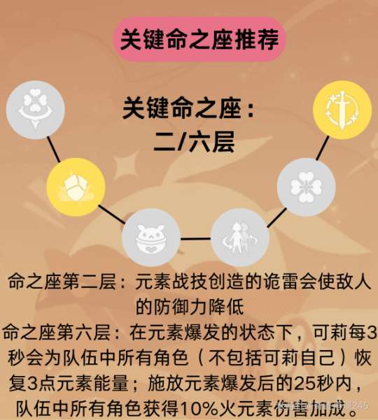 ④命座方面,第一层命之座使得挂火的频率更高,但会影响蒸发反应的持续触发,建议使用纯火流而不是蒸发流。而第二层命之座是可莉最大的命之座,提供了高价值的减防乘区,显著提升整体伤害,建议玩家抽取二命。后续的命之座对伤害提升的影响相对较小,而六命则提供了元素能量恢复和10%的火元素伤害加成,相较于其他角色的六命所提供的伤害提升要少一些。