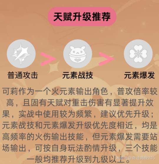 ③天赋方面,如果三个战斗技能都升级到九级,普通攻击就可以获得智识之冕。可莉的普通攻击存在后摇,但可以通过普攻后跳跃或者重击来规避。同样,元素战技的后摇也可以通过跳跃或者冲刺来规避,前提是有足够的条件。