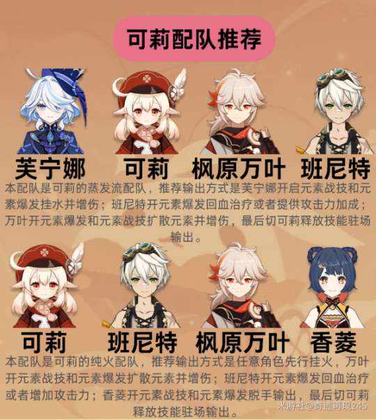 ⑤配队方面。可莉的三种配队分别是纯火、蒸发和烈绽放。除了图中所示的两种配队外,烈绽放配队通常会选择纳西妲、白术和夜兰作为队友,后台稳定地挂草以使烈绽放反应频繁触发。推荐的输出方式是,纳西妲先开启元素战技和元素爆发,然后可莉释放元素战技,夜兰释放元素战技和元素爆发挂水并增伤,白术则开启元素战技和元素爆发治疗回血,提供护盾并挂草。最后,可莉释放技能和普攻,完成一轮循环的驻场输出。